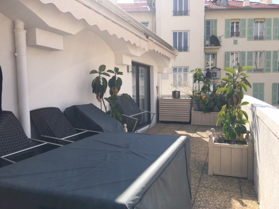 RUE DE RIVOLI - CARRE D'OR ...Belle adresse pour ce 3 pièces en dernier étage de 66,73 m² moderne et de qualité. Il se compose d'une pièce de vie de près de 35m², un grand couloir aménagé en dressing, une belle chambre de 12m² et une autre de 11m². La salle de douche est moderne et WC séparé par cloison coulissante. L'appartement dispose d'une grande terrasse de 25m² exposée Ouest et au calme avec stores bannes électriques. L'appartement est entièrement climatisé. Place de parking en sous-sol et cave - Proximité de la mer - Calme Loyer 1825€ (1690 € + 135 € provisions pour eau froide et charges de copro avec révision annuelle) Honoraires : 867 € (667+200€ pour EDL) A visiter sans tarder !