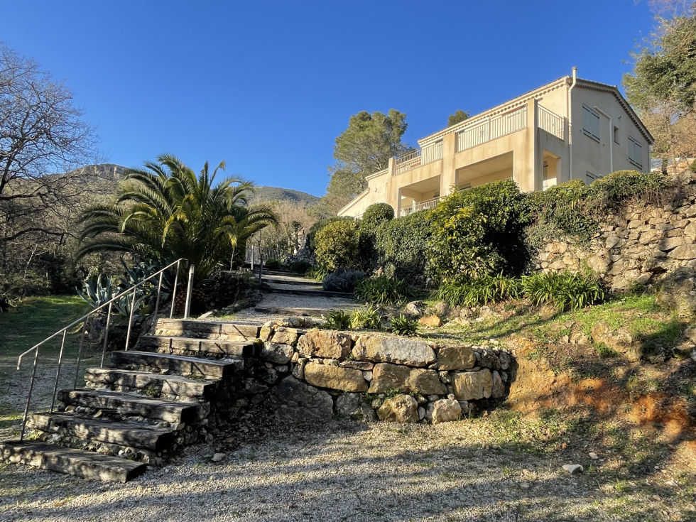 EXCLUSIVITE - A 5 minutes du charmant village médiéval de Tourrettes sur Loup, découvrez cette magnifique villa exposée plein Sud, au calme avec une belle vue dégagée sur les collines boisées. Construction de qualité offrant un grand confort : chauffage par le sol avec pompe à chaleur neuve, double vitrage, climatisation réversible, cheminée avec insert, alarme. Cette villa de 180m² propose de beaux volumes intérieurs avec ses grandes hauteurs sous plafond. Entrée, grand séjour avec cheminée, plafond cathédrale, belle cuisine équipée (plan de travail en pierre) ouvrant sur la salle à manger, bureau/5ème chambre, wc indépendant, buanderie/chaufferie. Grande terrasse couverte. Empruntez un bel escalier pour aller à l'étage : chambre de maître avec accès à un grenier et à une belle terrasse, salle d'eau avec douche à l'italienne et wc, chambre 2 avec salle d'eau et wc, Chambre 3 et 4, salle de bains complète avec douche, baignoire et wc. Grande hauteur sous plafond dans toutes les chambres. Belles terrasses. A l'extérieur, profitez d'une piscine et sa belle terrasse donnant sur un terrain de 2.500m² en restanques. En complément : un beau chalet de jardin, de nombreux stationnements et une fosse septique "aux normes". L'avis de l'agence : cette propriété très bien entretenue est en parfait état, elle allie confort et sérénité dans un cadre verdoyant. Toutes les pièces sont grandes et agréables ouvrant sur des terrasses. Si vous recherchez une villa de qualité, une visite s'impose !