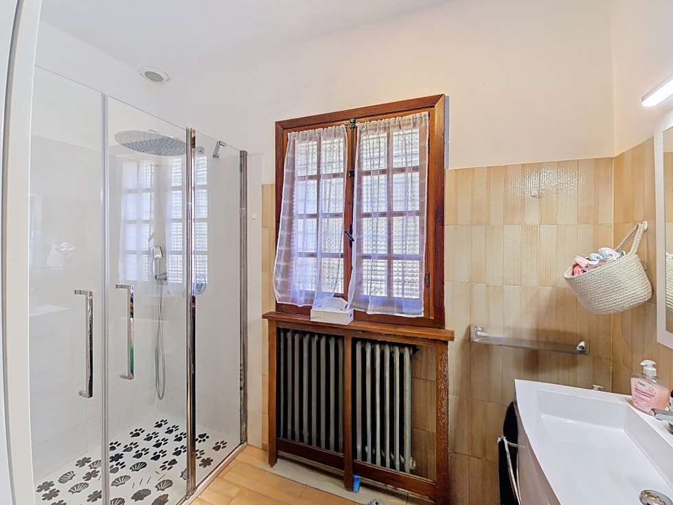 La maison, aujourd’hui organisée en deux appartements indépendants, propose de beaux volumes avec une belle hauteur sous plafond, apportant luminosité et caractère.