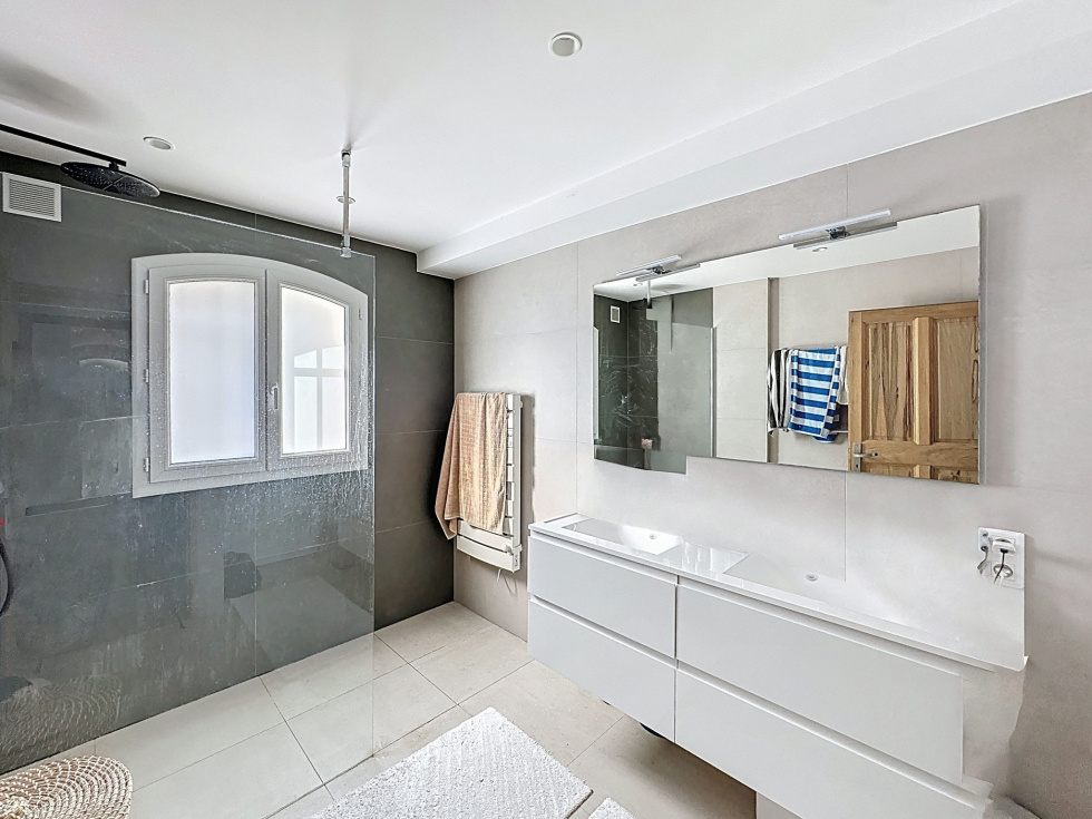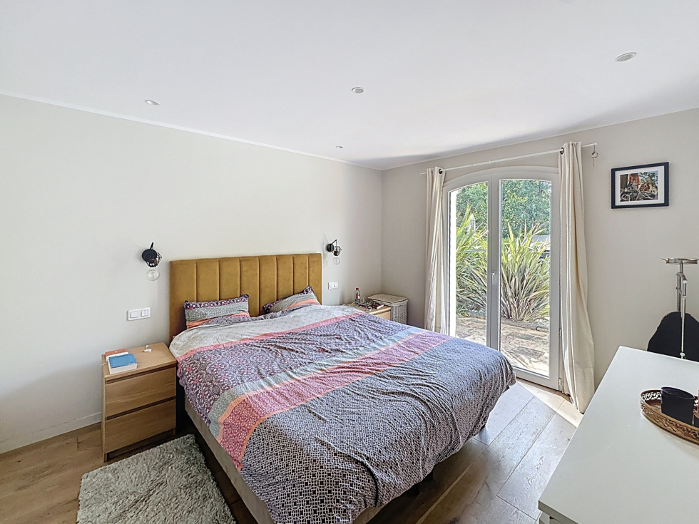 À l’intérieur, le rez-de-chaussée a été entièrement rénové avec goût et offre de belles prestations : une vaste pièce de vie lumineuse avec cuisine ouverte équipée, climatisation réversible, et une suite parentale de plain-pied avec dressing et salle de bains attenante. À l’étage, deux chambres confortables ouvrant sur une terrasse tropézienne, se partagent une salle de bains et un WC indépendant.