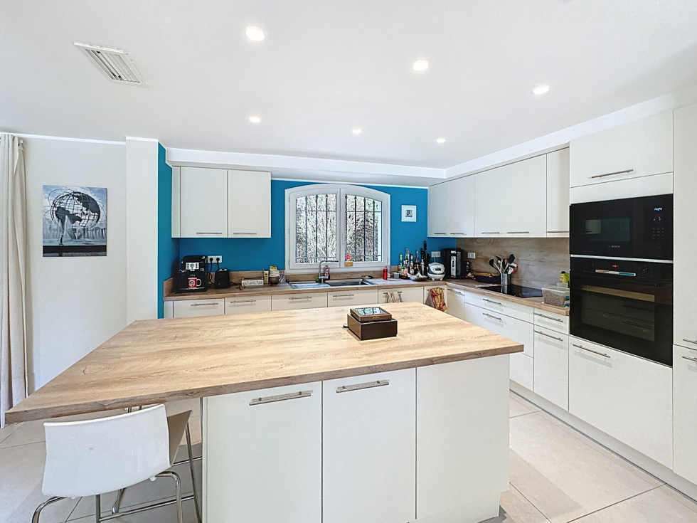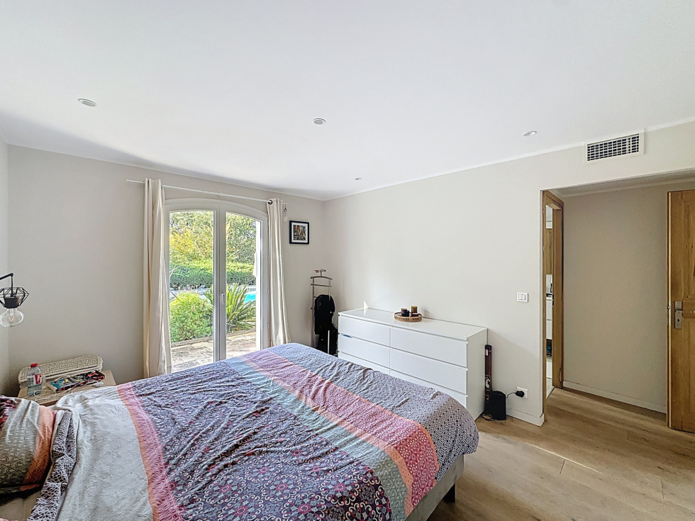 L’extérieur séduit immédiatement : un grand terrain plat agrémenté d’une belle piscine entourée de terrasses en teck, d’un espace barbecue et plancha, et d’un jardin parfaitement aménagé, offrant un cadre idéal pour profiter pleinement du mode de vie azuréen.
